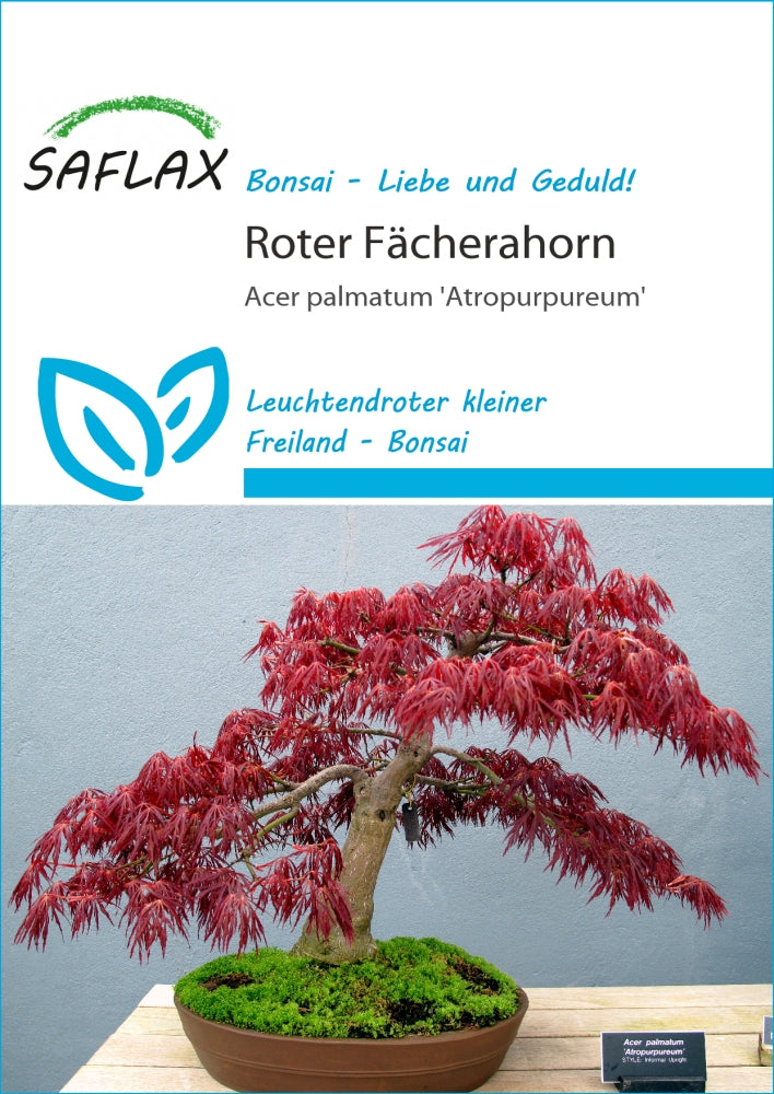 Aufgrund seiner grazilen Form mit halbrunder Krone ist der Fächerahorn ein in der Bonsaigestaltung beliebter kleiner Baum. Der Begriff palmatum leitet sich vom lateinischen palma = Handfläche ab und weist auf die fingerartig geschlitzten Blätter hin. Die dunkelroten Blätter gehen im Herbst in leuchtendes Karminrot über, bevor der Baum zum Winter seine Blätter abwirft.