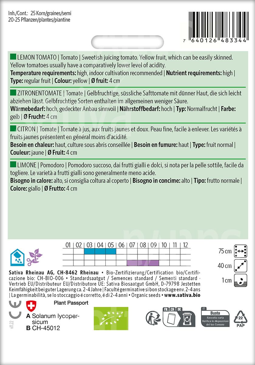 Die Zitronentomate ist eine gelbfruchtige, süssliche Safttomate mit dünner Haut, welche sich leicht abziehen lässt. Im allgemeinen enthalten gelbfruchtige Sorten weniger Säure.